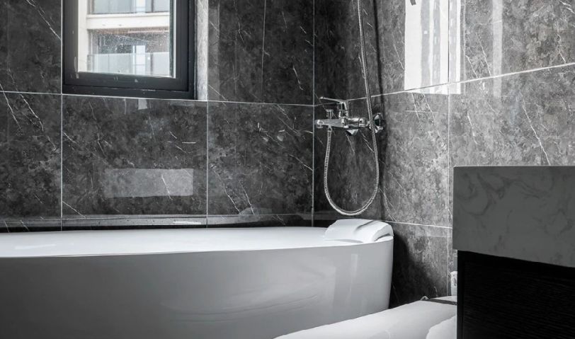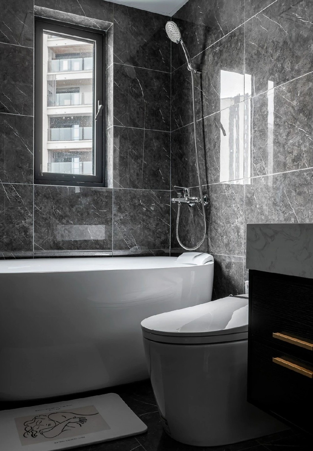 衛(wèi)生間,深灰色石紋瓷磚滿鋪搭配潔白的衛(wèi)浴,實用與顏值兼具