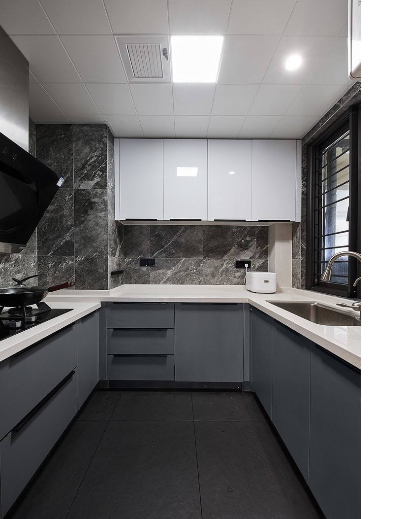 廚房,仿大理石磚與雙飾面門板打造通透敞亮的空間。高低臺(tái)面的設(shè)計(jì),提升廚房的使用體驗(yàn),烹飪時(shí)更加方便。