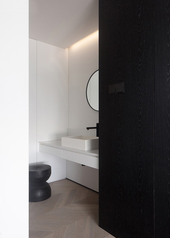 我們高效利用尷尬的轉(zhuǎn)角位置,將其做成較為隱蔽的干區(qū),形成干濕分離,使得屋主生活更便 捷。圓形的鏡面與隱藏式燈光讓這方小小的空間富有浪漫的生活情調(diào)。