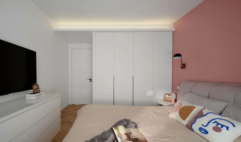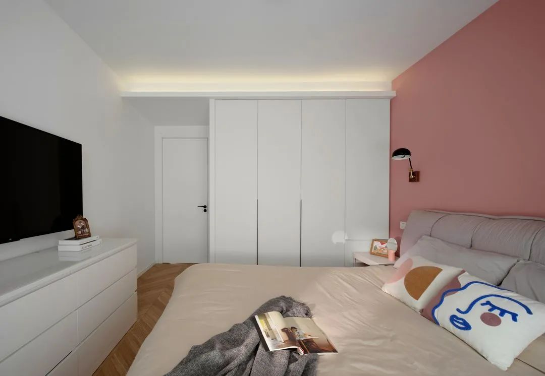 主臥布局緊湊實(shí)用,不同色彩的運(yùn)用將公私區(qū)域做了清晰的區(qū)分,與安靜大氣的灰綠不同,臥室背景墻用粉紅色營(yíng)造出甜蜜歡快的私密氛圍
