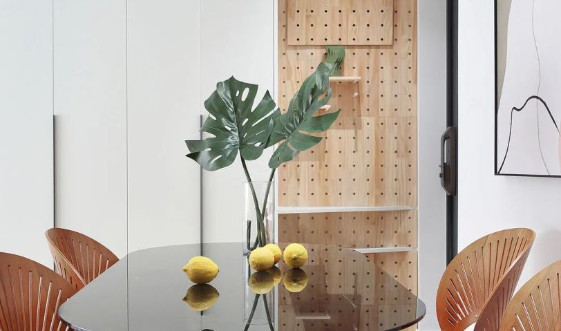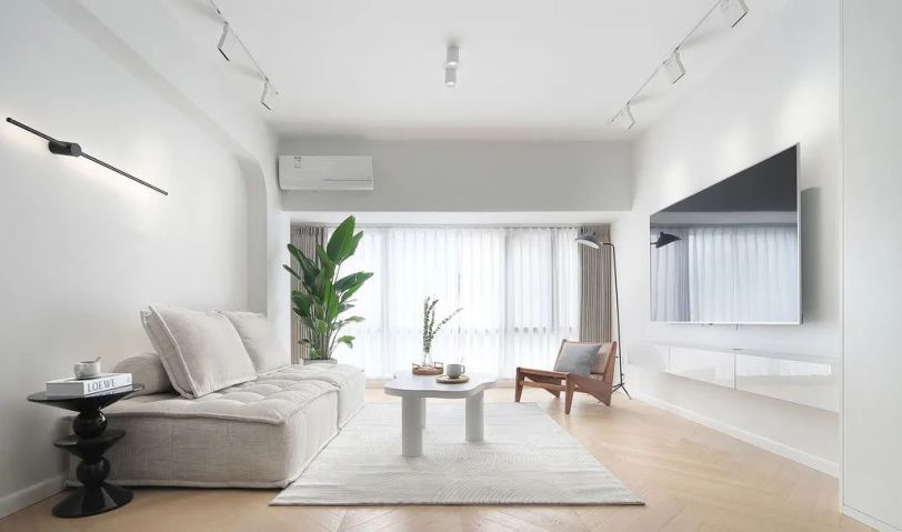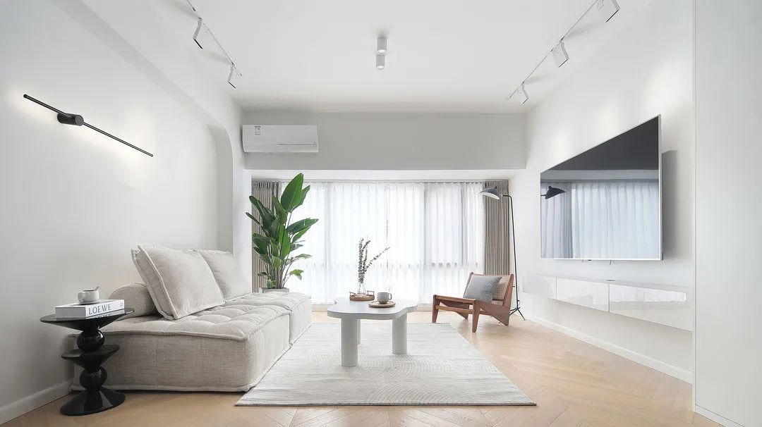 整個空間都是呈現(xiàn)出簡約的狀態(tài),木色作為地面基色搭配素白的色調(diào),綠色作為跳躍色,剛好拼湊在這個空間里。在設(shè)計上,沙發(fā)背景墻設(shè)計了一個有弧度的造型,提升線條美感,放眼望去,會比直角更加柔和。