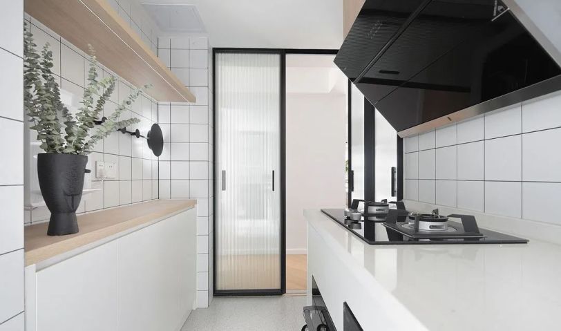 廚房做了無主燈設(shè)計,筒燈能讓整個空間更溫暖明亮有層次。原木色搭配小方磚、水磨石地板,整個空間清新自然,加入長虹玻璃的滑動門,為廚房空間賦予了另一種情調(diào)。下方做柜子,完美解決收納問題。