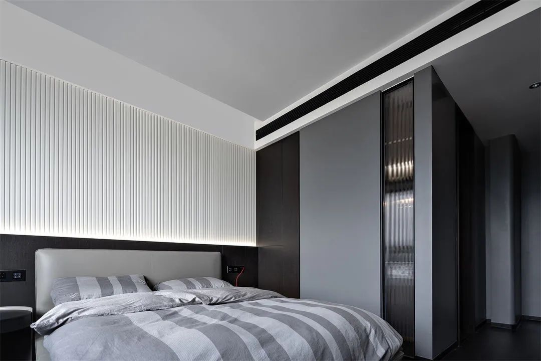 簡潔的臥室讓人心情愉悅,雖說是灰黑調(diào)風格,但設計師為了溫潤整個空間,在床頭的墻縫處增添了一排燈光,讓整間臥室溫暖起來。