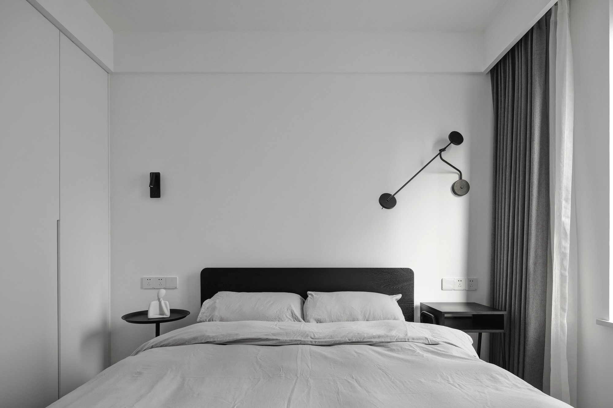 次臥純色床頭背景墻,用一對(duì)壁燈裝飾,氛圍剛剛好,據(jù)說現(xiàn)在這個(gè)臥室被貓貓占領(lǐng)。