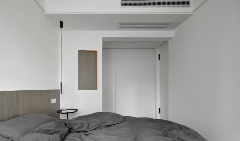 主臥床頭硬裝造型,設(shè)計(jì)感十足,一整面衣柜,增強(qiáng)儲(chǔ)物功能。