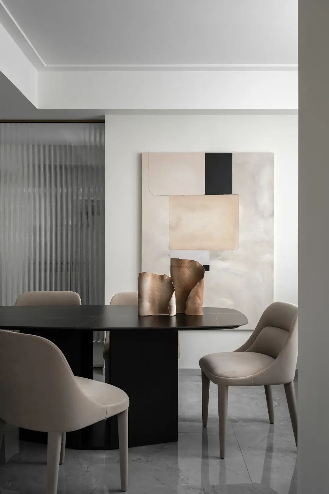 深色的生活氣,在整體的色調(diào)中加以深色的點(diǎn)綴,布藝的餐椅中和大理石餐桌的高冷,讓餐廳更加溫馨而富有生活氣息。