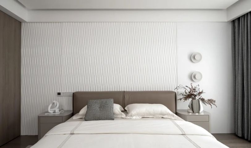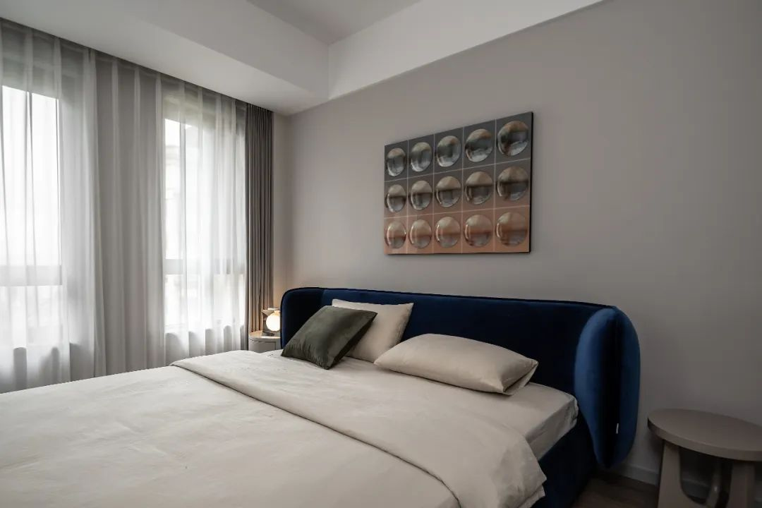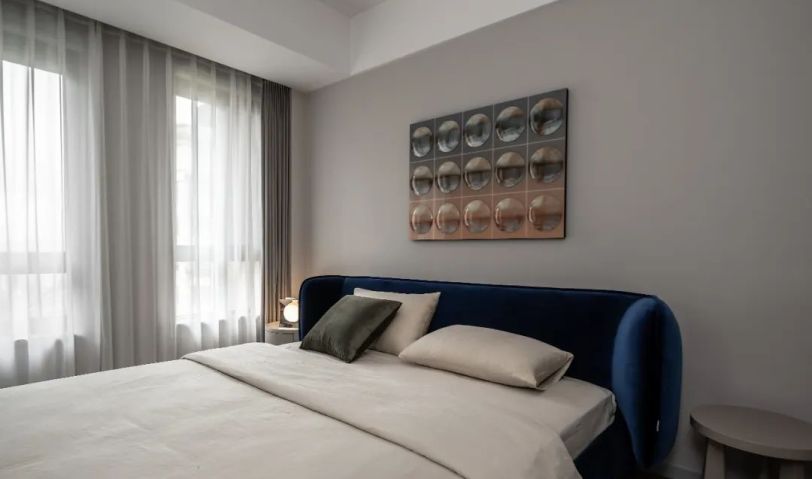 延續(xù)簡練、質(zhì)感的主題,臥室無需復(fù)雜的硬裝,墨藍(lán)色的床搭配立體摩登的裝飾畫盡顯優(yōu)雅。