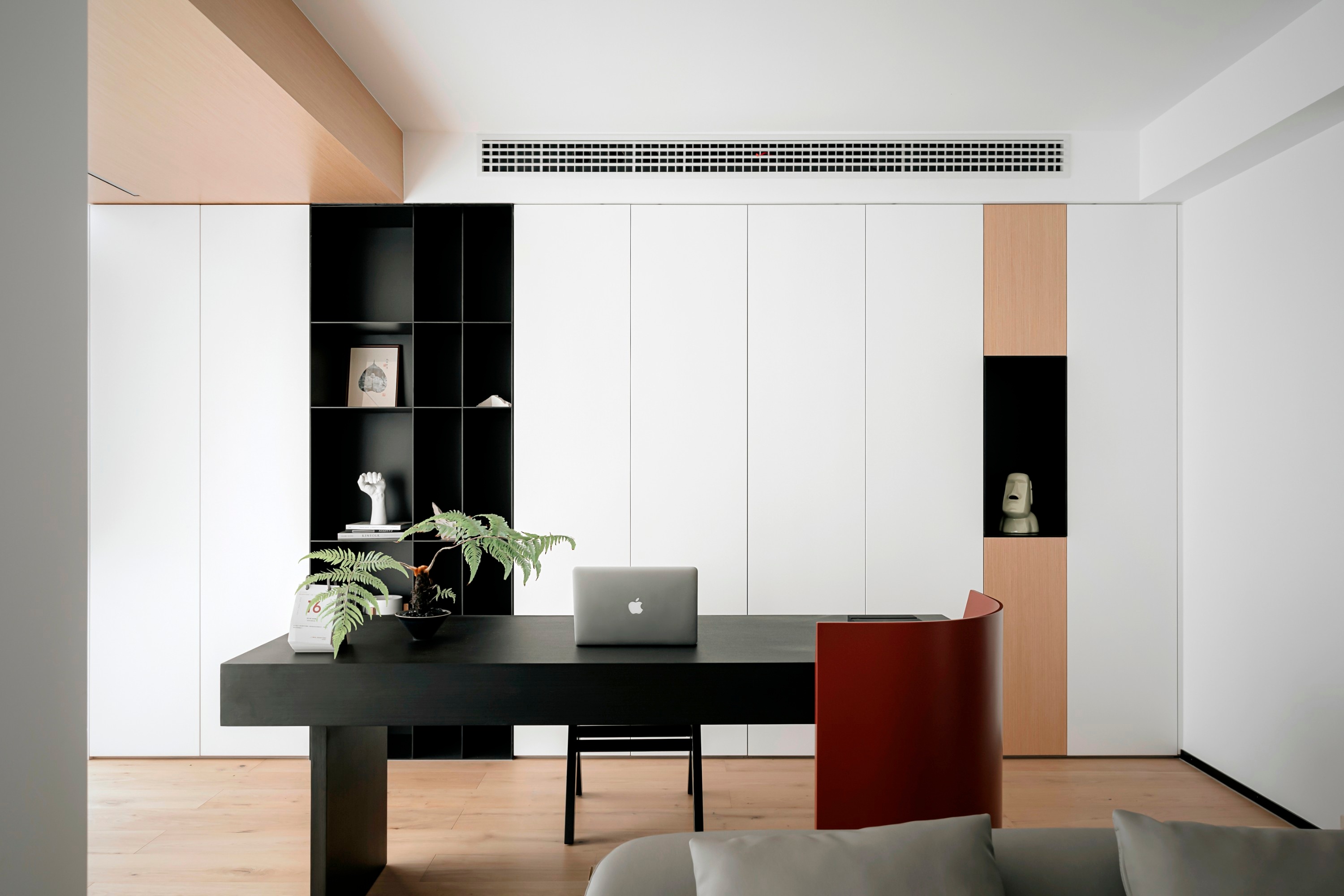 黑色幾何感書桌彰顯著主人的審美格調(diào),同時根據(jù)屋主的需求增設(shè)一列儲物柜,強(qiáng)化書房功能性。