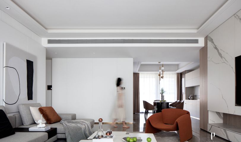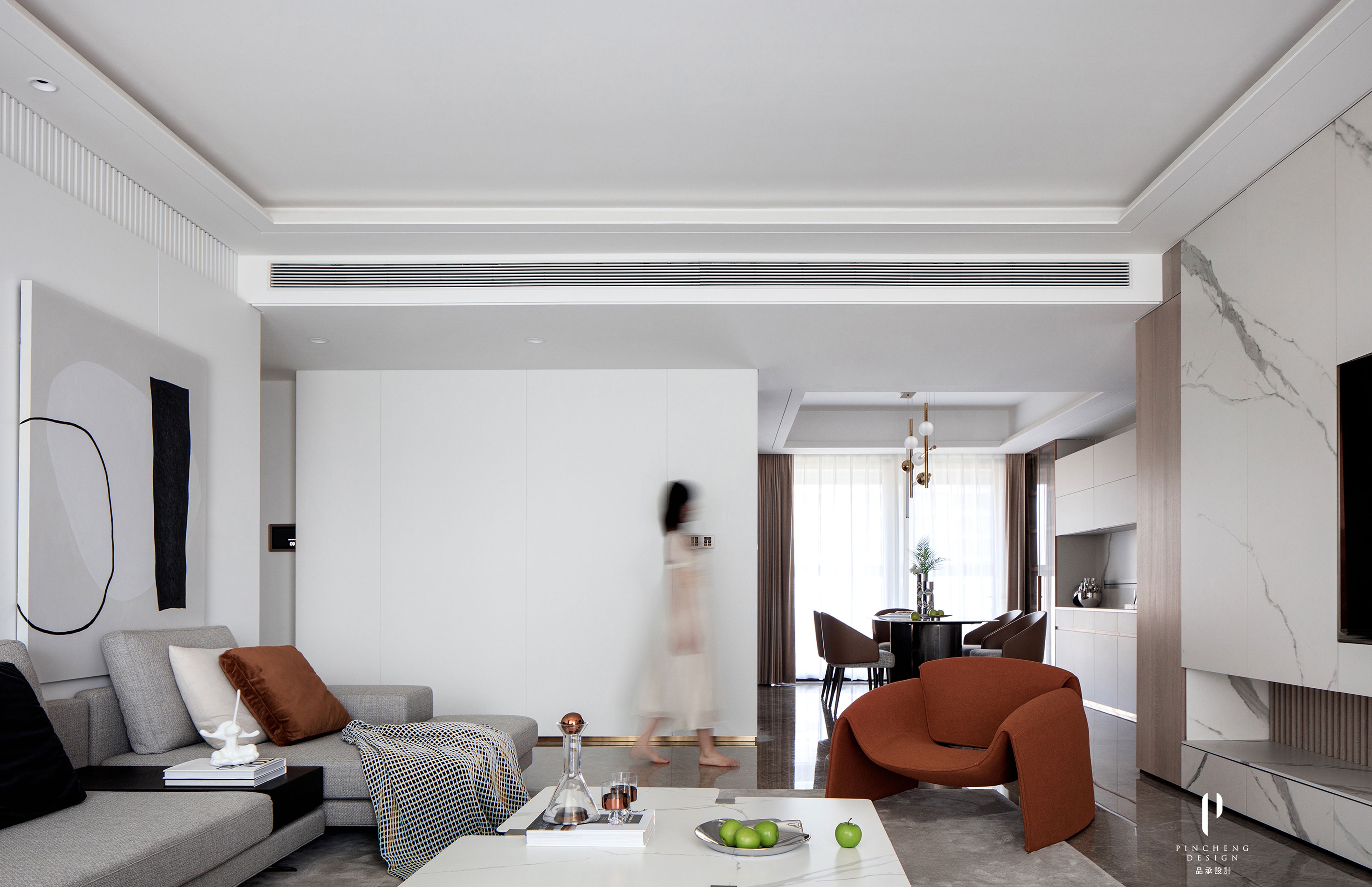 客廳不加修飾的白色背景墻通過(guò)錯(cuò)層形式豐富視覺(jué)效果,個(gè)性的家具提升了整體空間的調(diào)性?;疑纳嘲l(fā)具有超級(jí)精致的視覺(jué)感受和舒適體驗(yàn),灰與白的界限中,融入橙色的單體沙發(fā),在空間中劃出鮮明色調(diào),多了些許生活的溫度,與空間完美契合。
