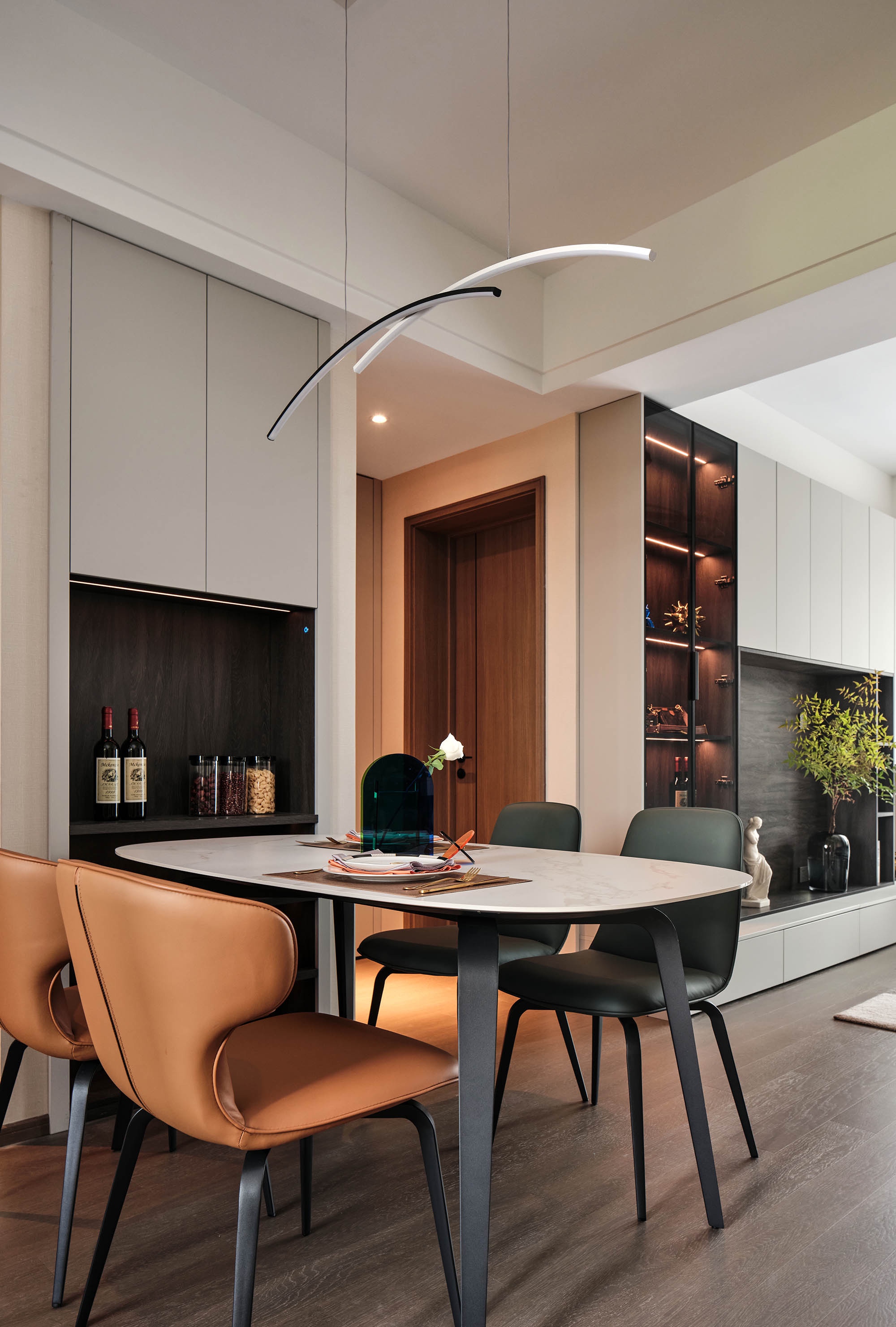 輪廓形態(tài),平衡了感性和理性的氣質(zhì),講述著浪漫的就餐故事。削弱棱角的銳利鋒芒,演繹曲線流轉(zhuǎn)的動態(tài)之美,一邊勾勒空間造型的別致意境,一邊延續(xù)張弛有道的布局,在歲歲年年中抒發(fā)情意。