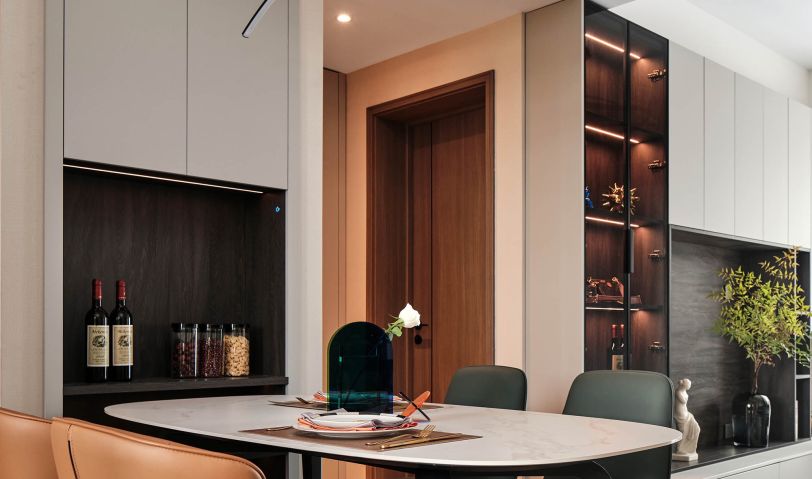 空間記錄著自然光隨性穿梭的氣韻,將簡奢、明亮、低調(diào)的多種元素混合搭配,塑造出都市美學(xué)的簡約型格。上淺下深的用色法則運(yùn)用,既展露材質(zhì)的溫潤美感,又以與人互動的體感和動線沉淀出高雅品味。