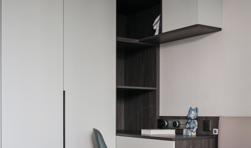 選用暗色調(diào)加強(qiáng)空間的簡雅質(zhì)感,借細(xì)膩木紋為睡眠環(huán)境嫁接親密性,串聯(lián)富有情調(diào)的布藝,隨著豎向線條的分割、轉(zhuǎn)折、排列,流露出沉靜的氣氛。定制通頂柜體保持統(tǒng)一美感,布置層架細(xì)節(jié),表達(dá)收納和展示的趣致。