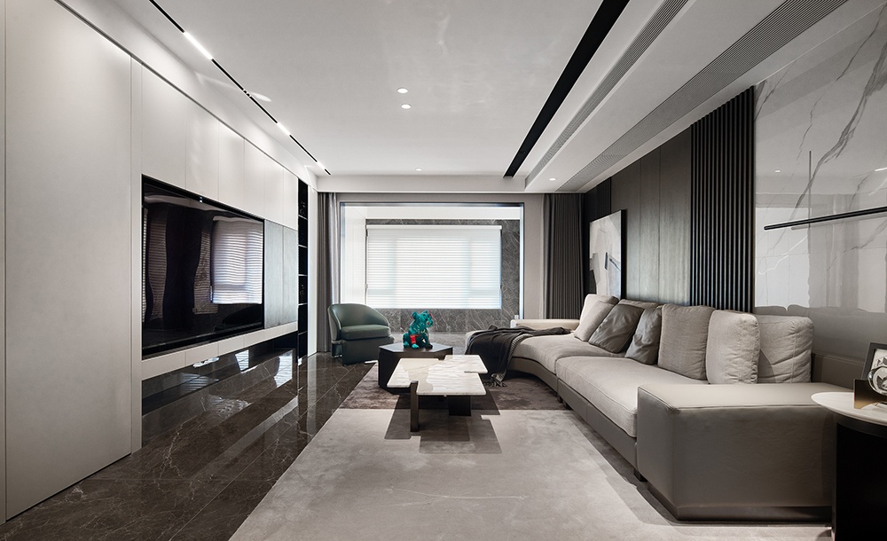 無主燈式的設(shè)計,弱化亮點,同時以不同灰度的沙發(fā)來加強視覺中心,搭配不同材質(zhì)組成的背景墻,展現(xiàn)不同層次的美,在視覺上既擁有張揚的既視感,又不乏別樣的寧靜美感。