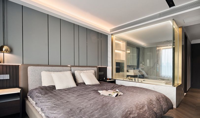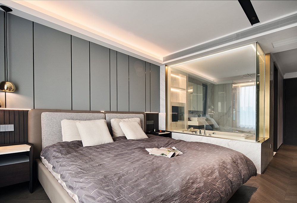 臥室的風格更偏向輕奢,不同于客餐廳,以淡色系作為基調(diào),展現(xiàn)舒適的畫風。讓居住者在進入臥室的一瞬間,就放下滿身的疲憊。沒有過于復(fù)雜的元素,只用金屬線條作為點綴,簡單與精致在這里并不顯得沖突。