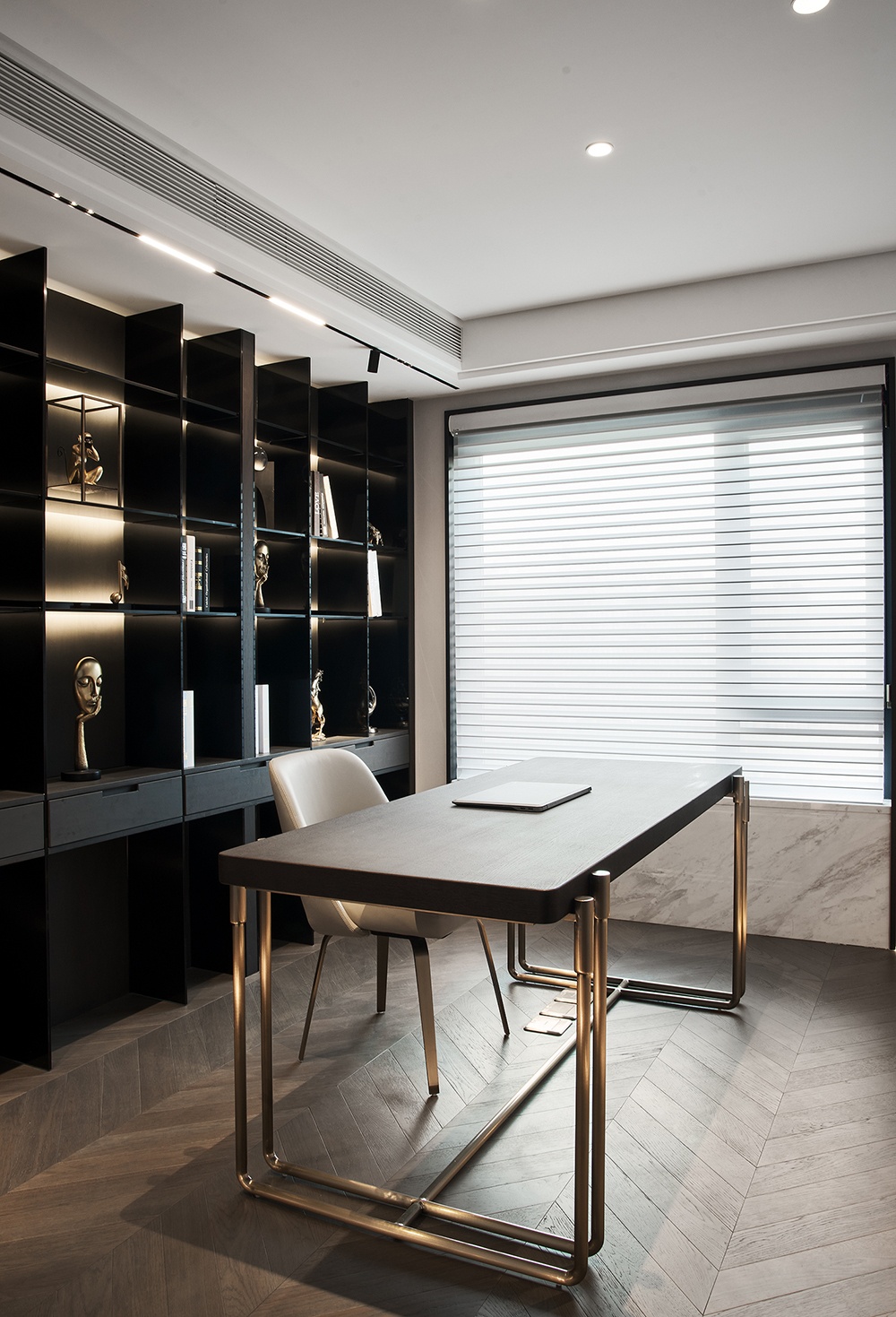 書房既是男主人的工作室,又是他的閱讀間。深褐色收納架與魚骨拼木地板的搭配,仿佛淡中有味清中貴的美式咖啡,低調(diào)不張揚,氣韻悠長,回味是高級的滋味。每一個日常都藏著居住者專屬的優(yōu)雅。