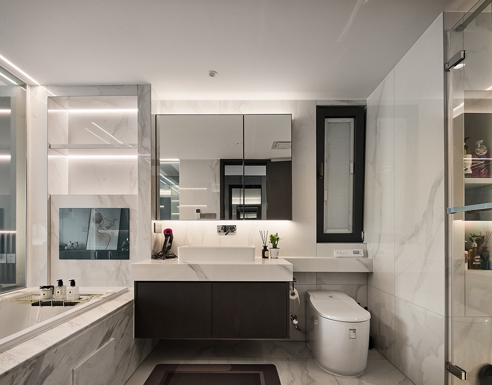 將主臥的光線引入衛(wèi)浴空間,大面積的白色空間在視覺上得到延展,盡顯空間優(yōu)越的整體感。
