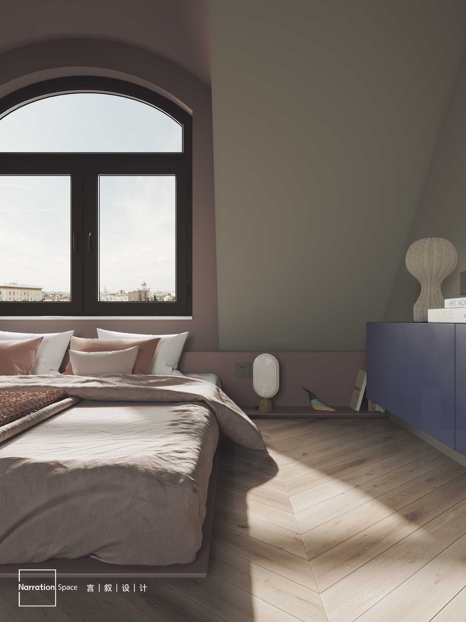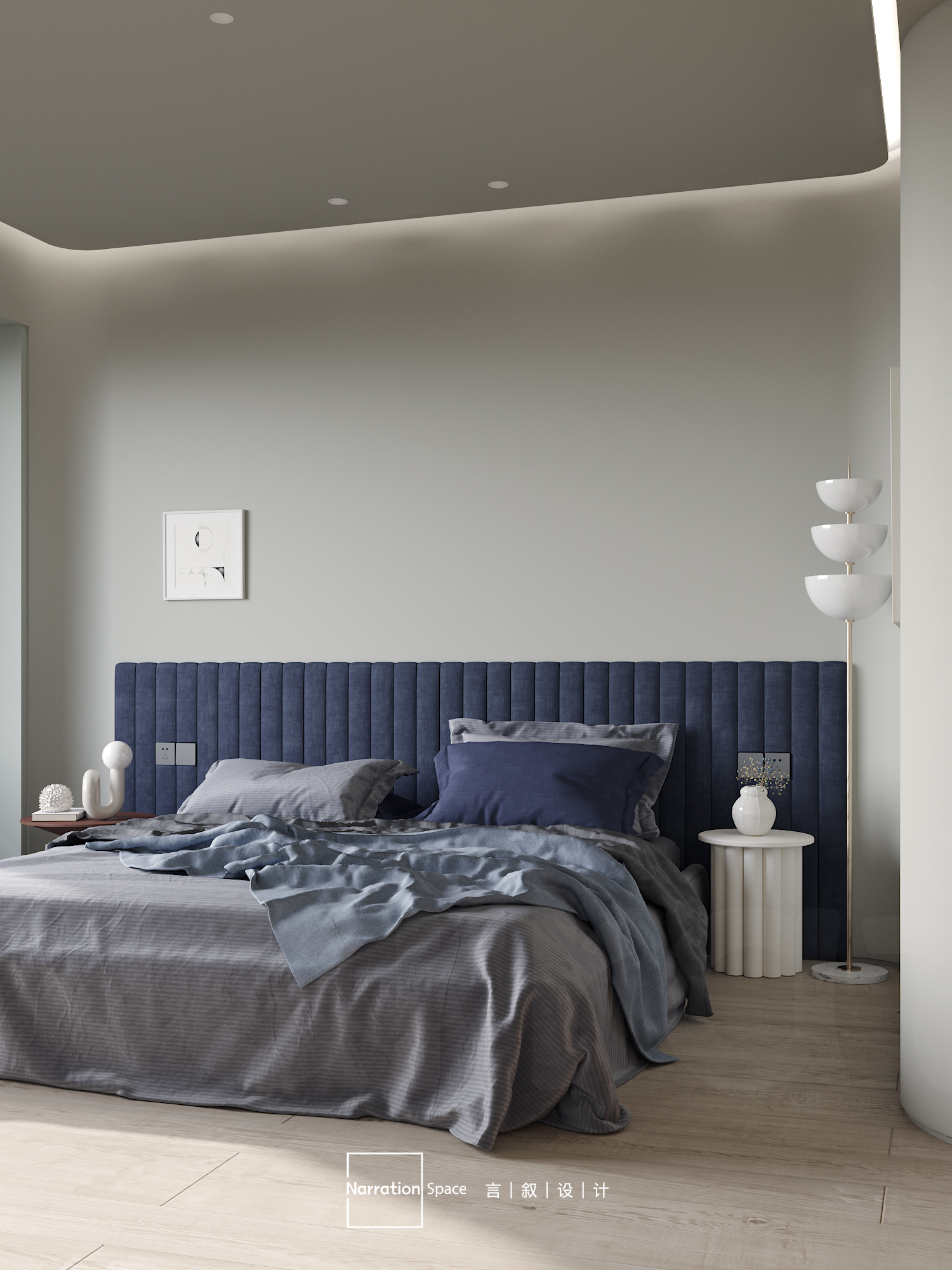 臥室?;疑徒?jīng)典藍(lán)的結(jié)合讓空間變得神秘、靜謐;空間延續(xù)整體的弧形結(jié)構(gòu),產(chǎn)生直觀的細(xì)膩感受;頂部圓角矩形狀燈帶增添整體層次感,同時足以在夜間溫暖人的感官。