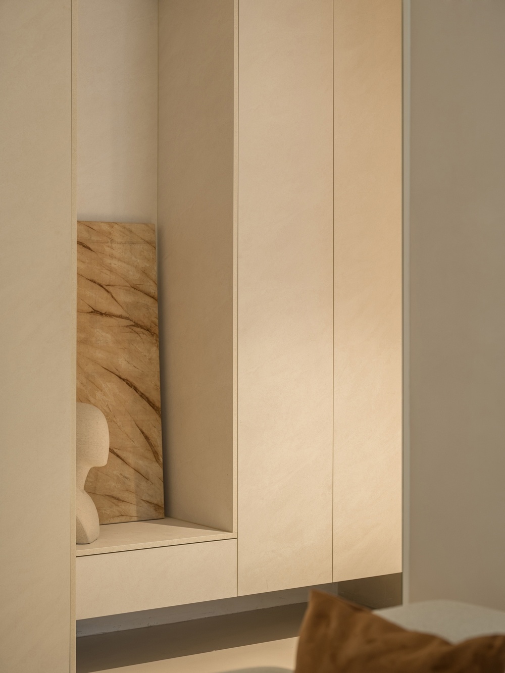 入戶左手邊打造玄關(guān)柜,通高柜體增加收納容量,預(yù)留換鞋凳位置,更方便日常使用,下方留空,便以收納進(jìn)出替換的鞋品等,保持玄關(guān)整潔干凈。