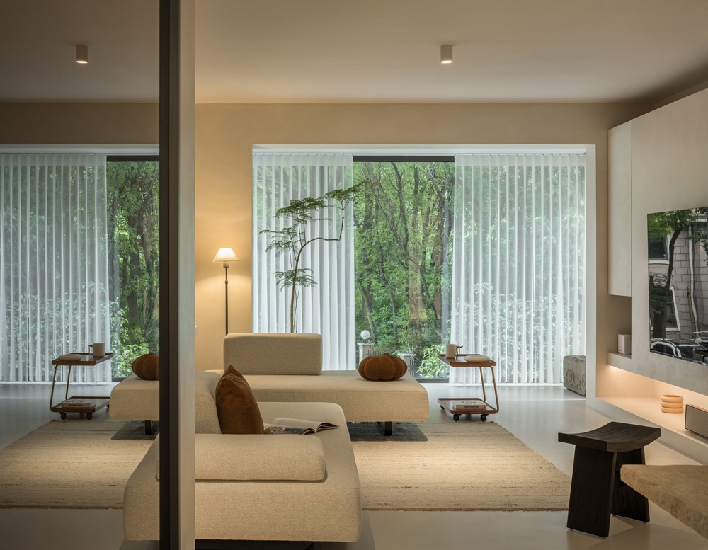 陽(yáng)臺(tái)與客廳打通無(wú)界,利用大幅落地窗引景入內(nèi),滿目野蠻生長(zhǎng)的綠打破室內(nèi)外的界限,將自然的生命力帶入室內(nèi)視野,室內(nèi)純粹圓融的米色系空間是最佳的映襯,于一側(cè)肆意生長(zhǎng)的植株,同室外形成呼應(yīng),一內(nèi)一外,生命力攀生,交織出令人滿目舒暢的視覺效果。