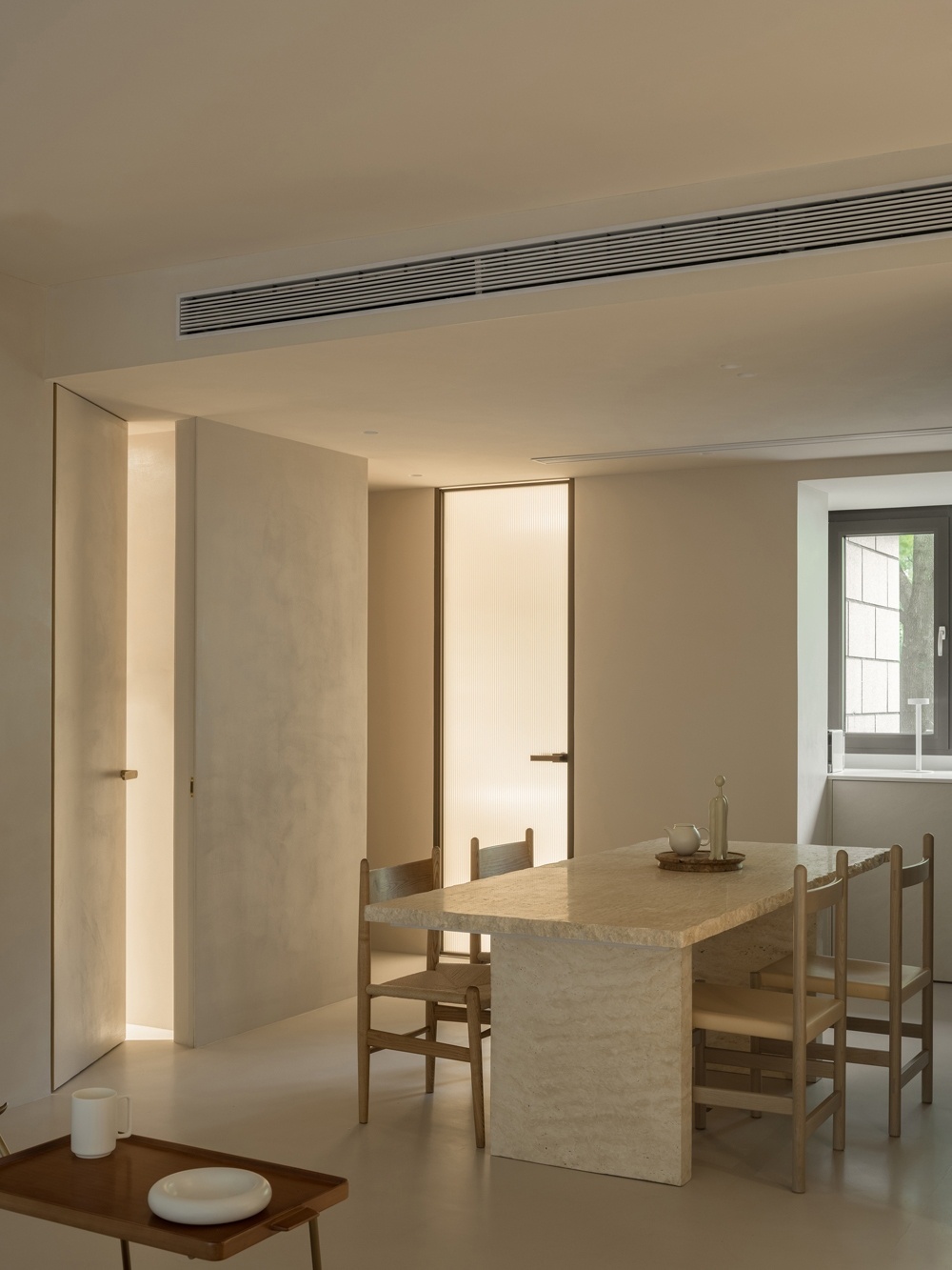 餐廳整體安裝吊頂,內(nèi)藏中央空調(diào)送風(fēng)系統(tǒng)等各色管道,視覺上劃分功能區(qū),且不會(huì)突兀。定制大理石餐桌,吧臺(tái)餐桌一體,足夠容納多人前來(lái)做客聚餐,與中廚西廚動(dòng)線均方便快捷,可以作為操作臺(tái)面補(bǔ)充使用,功能更為多樣化。