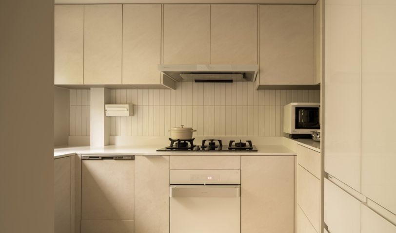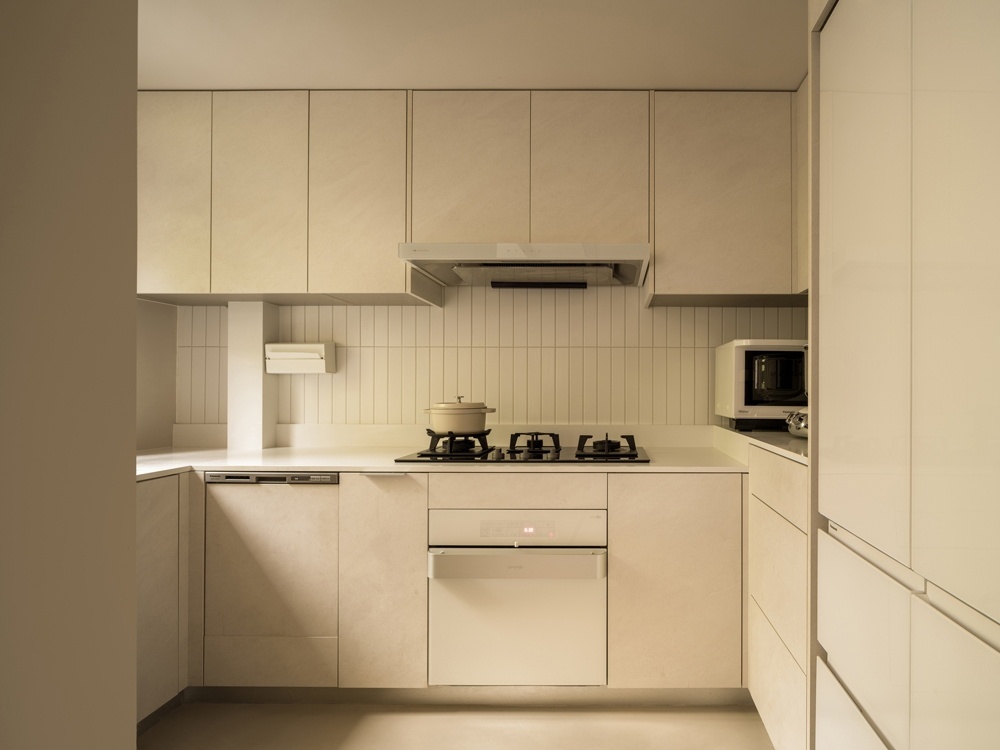 廚房采用半開放式布局,日常使用更為靈活便利。下廚時(shí)不比擔(dān)心油煙溢出影響其他空間,深茶色玻璃移門兼具通透感與私密性,既通透又能起到一定的視覺遮擋效果,同時(shí)跟低飽和純色空間形成色差碰撞,視覺效果更為豐富。