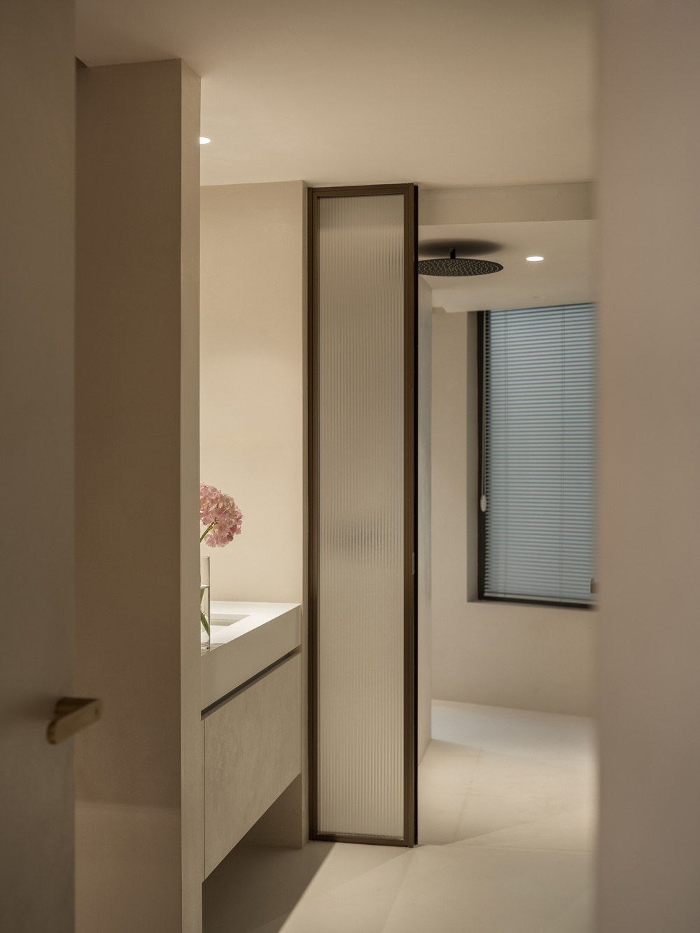 以玻璃移門分隔主衛(wèi)與陽(yáng)臺(tái),開放獨(dú)立靈活控制,使用更為方便。衛(wèi)生間同樣是墻頂?shù)匾惑w,無(wú)障礙淋浴間的設(shè)計(jì),對(duì)防水施工要求更高,以專業(yè)性的工藝技術(shù)實(shí)現(xiàn)理想設(shè)計(jì),給予屋主理想的品質(zhì)生活。