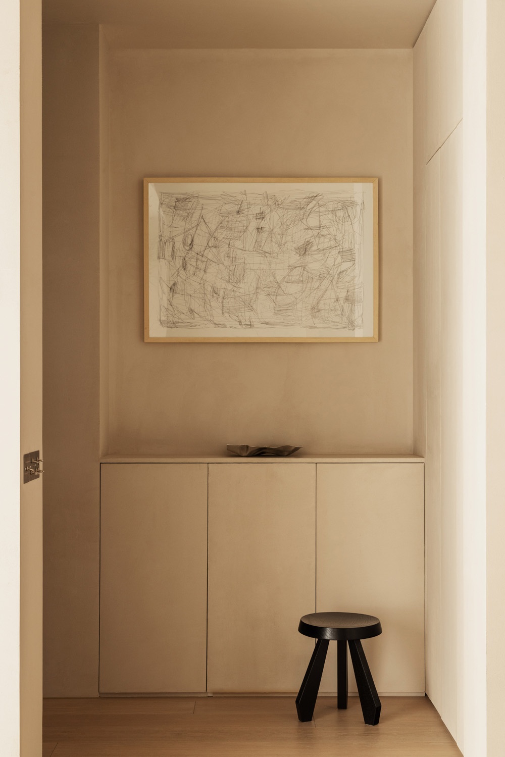 玄關(guān)設(shè)計(jì)了鞋柜和儲(chǔ)物柜,用來放鞋的矮柜上方可以隨手放置鑰匙、門卡等瑣碎物件。極簡的柜門表面刷了和墻面一樣的藝術(shù)漆,更有整體性。