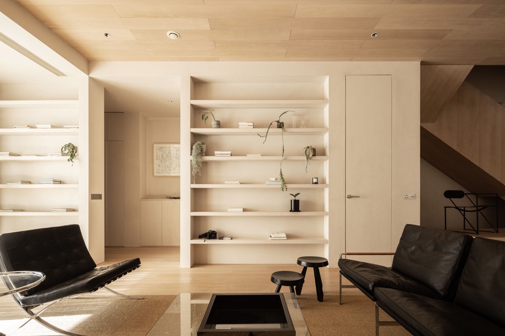 書墻表面依舊刷了米色涂料,讓它與墻面材質(zhì)色彩一致,也和周圍的木色十分搭調(diào)。