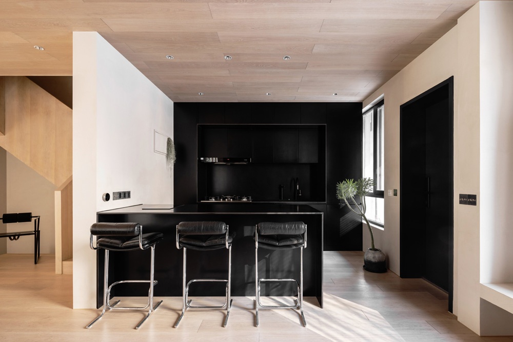 櫥柜前面是一個(gè)巖板做的黑色島臺(tái),與后面的背景形成呼應(yīng),三把吧臺(tái)椅都是在Concept 101淘的中古椅,柔軟的皮墊坐感很棒。