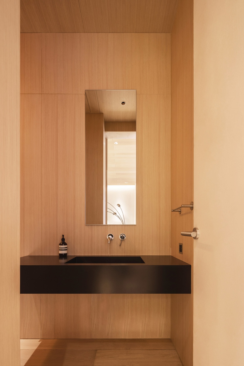 黑色巖板洗手池頗具質(zhì)感,金屬色的鏡邊和水龍頭相呼應(yīng),細(xì)長的鏡子讓層高看起來更高。