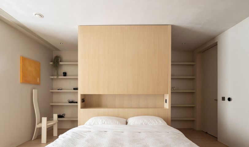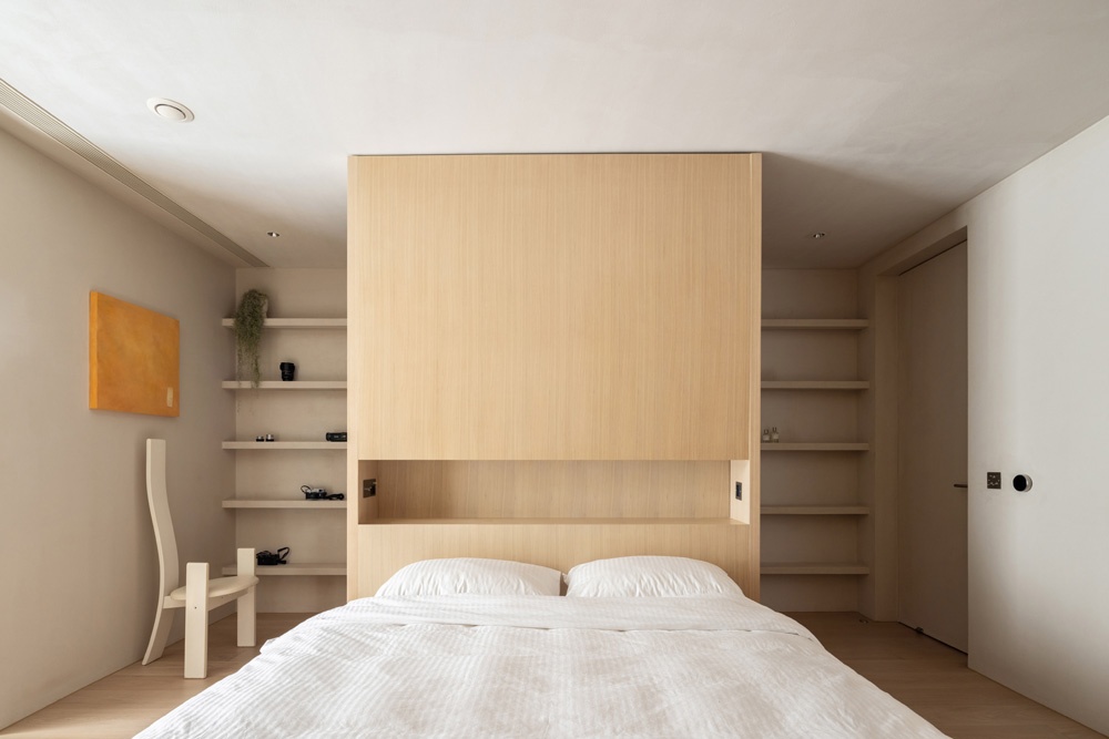 床在臥室的中心,因?yàn)楸趁嬖O(shè)計(jì)了通頂?shù)谋嘲?,所以整體形成了一個(gè)“洄游動(dòng)線”。