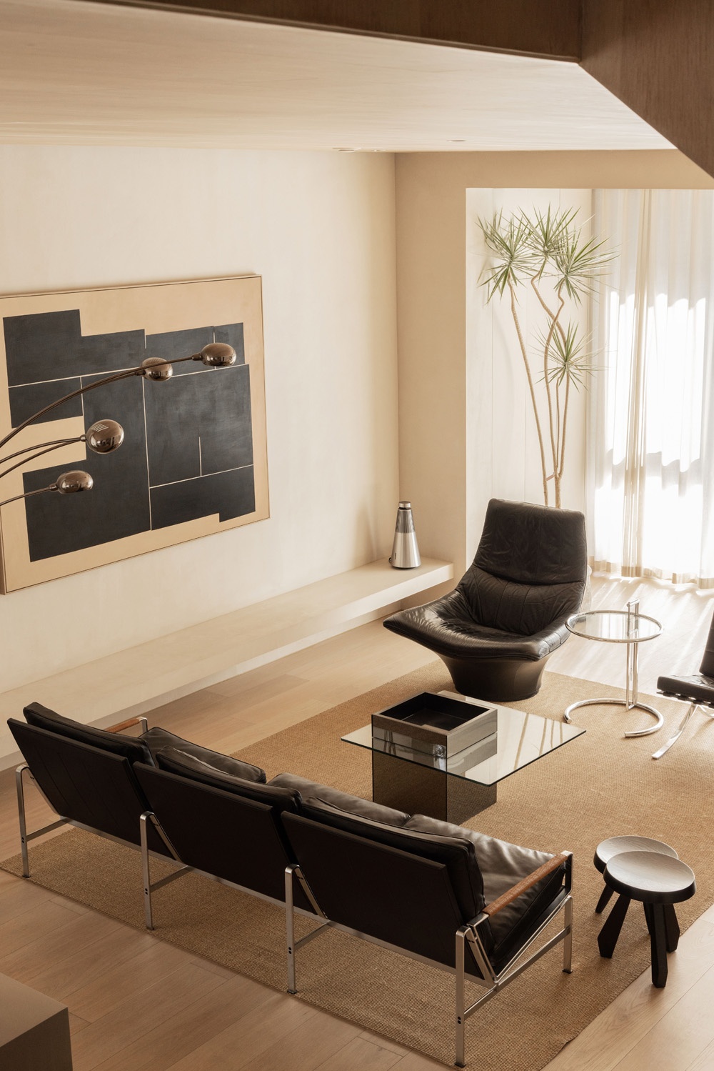 煙熏色玻璃茶幾造型硬朗有力,光亮的玻璃表面和地上粗糲的劍麻地毯形成一種精與糙的對比。