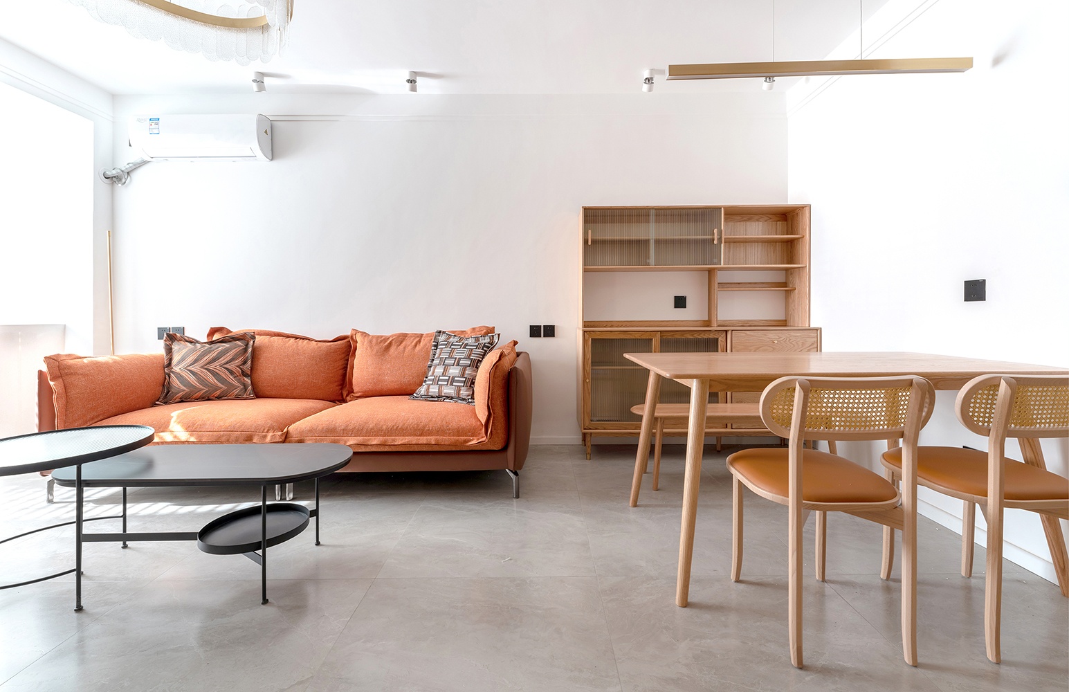 沙發(fā)背景墻相對簡潔,餐柜餐桌椅選了接近電視背景墻一樣的用色,保證空間的材質(zhì)盡可能的統(tǒng)一