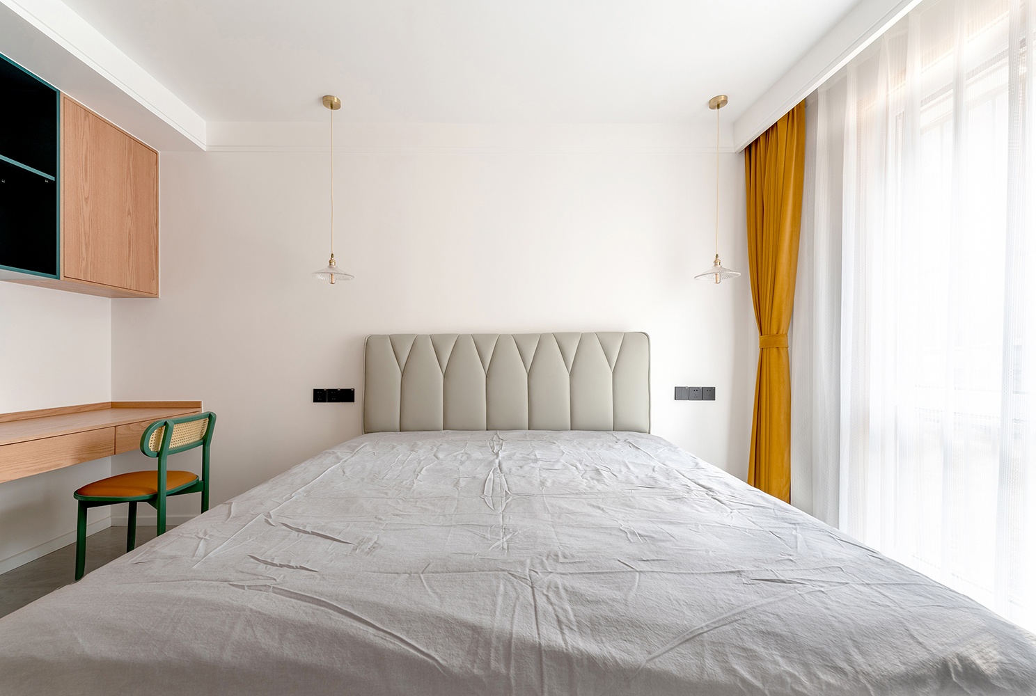 主臥空間依舊延續(xù)客廳風(fēng)格,白+原木色搭配焦糖色的窗簾,成為了整個空間的主角。