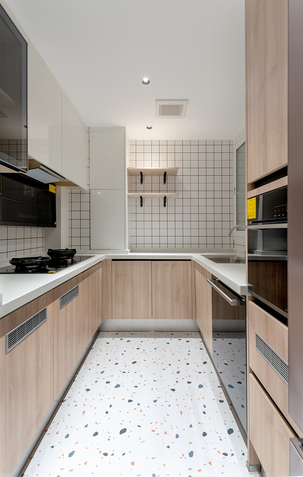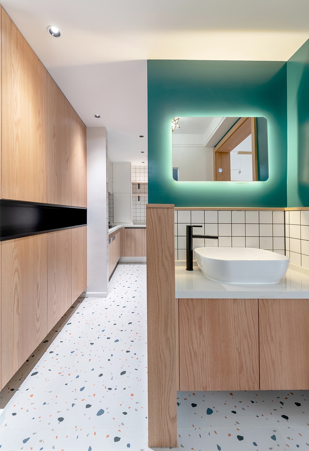 廚房空間擴(kuò)大以后增加了操作和儲物空間,女主喜歡烘焙,特意增加了烘烤箱。網(wǎng)紅小白磚搭配水磨石,顏值滿滿,讓空間成了大顯身手的地方。