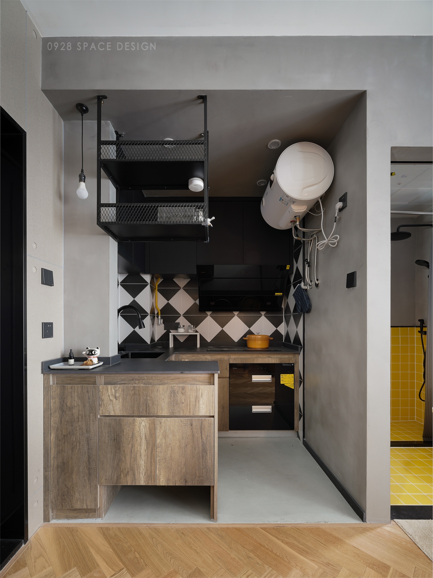 業(yè)主平時(shí)工作較忙,偶爾料理,因此廚房的需求不大,廚房門拆除后采光較好,料理臺(tái)和櫥柜同為灰色系,地柜則用了原木色,墻壁貼了黑白格紋的瓷磚,地磚選的是灰色,耐臟好打理。玄關(guān)鞋柜與料理臺(tái)連接,同時(shí)充當(dāng)小吧臺(tái),上方為懸掛酒架,旁邊一盞懸掛燈泡,工業(yè)感十足。