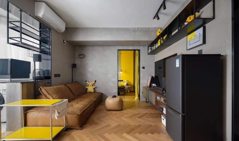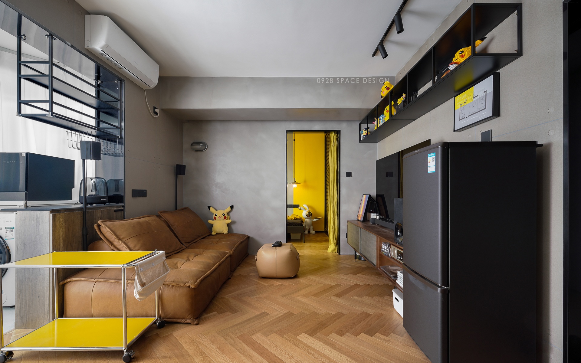 背景墻用清水混凝土水泥板及微水泥飾面,搭配黑色的家電和展示架,利用原木色人字拼木地板和棕色皮質(zhì)沙發(fā)進(jìn)行過(guò)渡,配上業(yè)主喜歡的明黃色和皮卡丘擺件,沉穩(wěn)中帶著俏皮?;瑒?dòng)置物架充當(dāng)邊幾,容量大而方便。客廳無(wú)主燈的設(shè)計(jì),利用氛圍燈和局部照明,營(yíng)造溫馨的感覺。角落的一盞鑄鋁壁燈,將復(fù)古工業(yè)感發(fā)揮得淋漓盡致。
