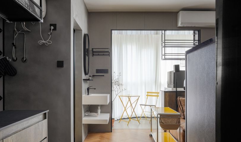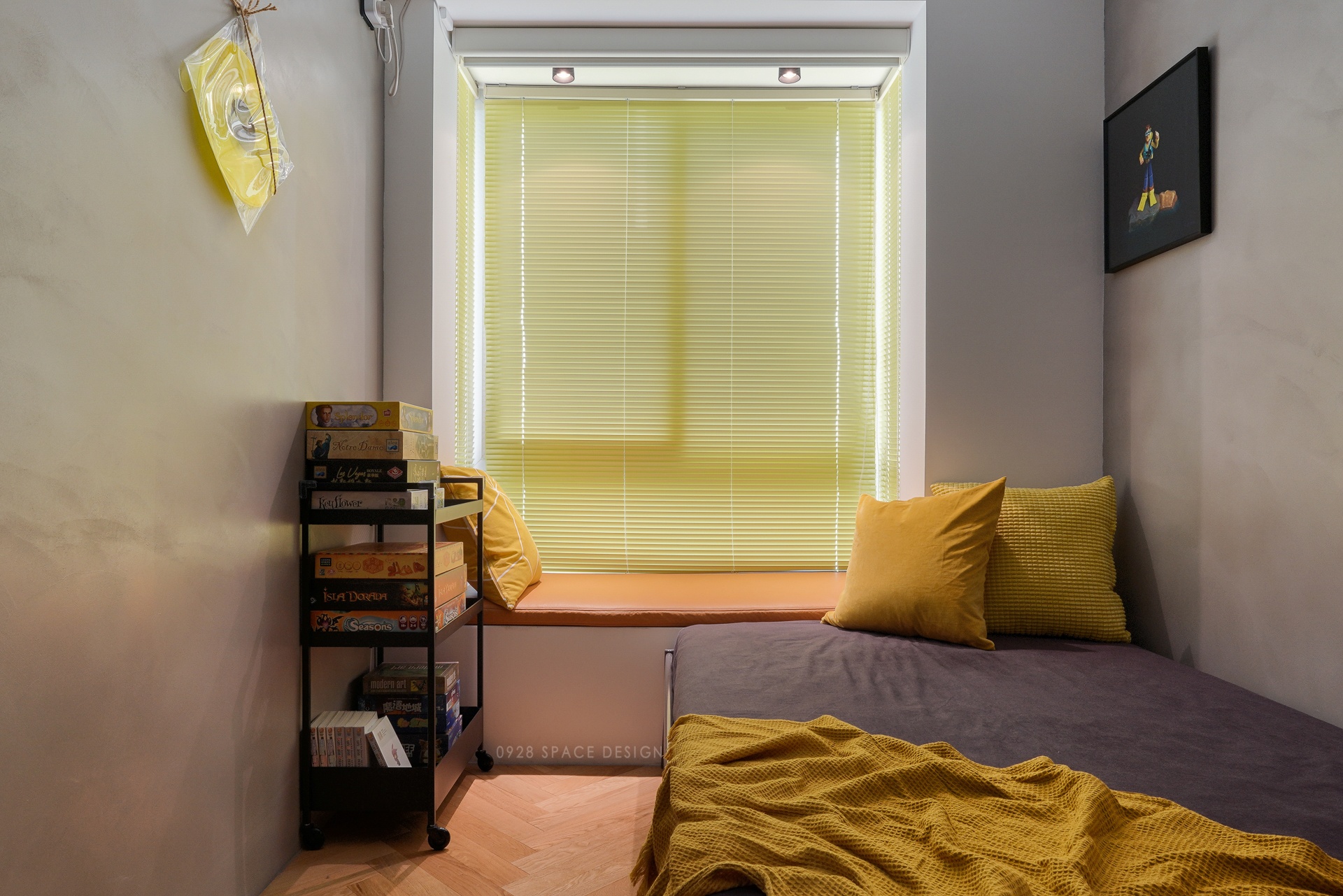 業(yè)主一個(gè)人居住,所以臥室門用布簾代替,減少了門的厚重感,黃色布簾一定程度上緩和了清水混凝土水泥板和微水泥的硬朗。