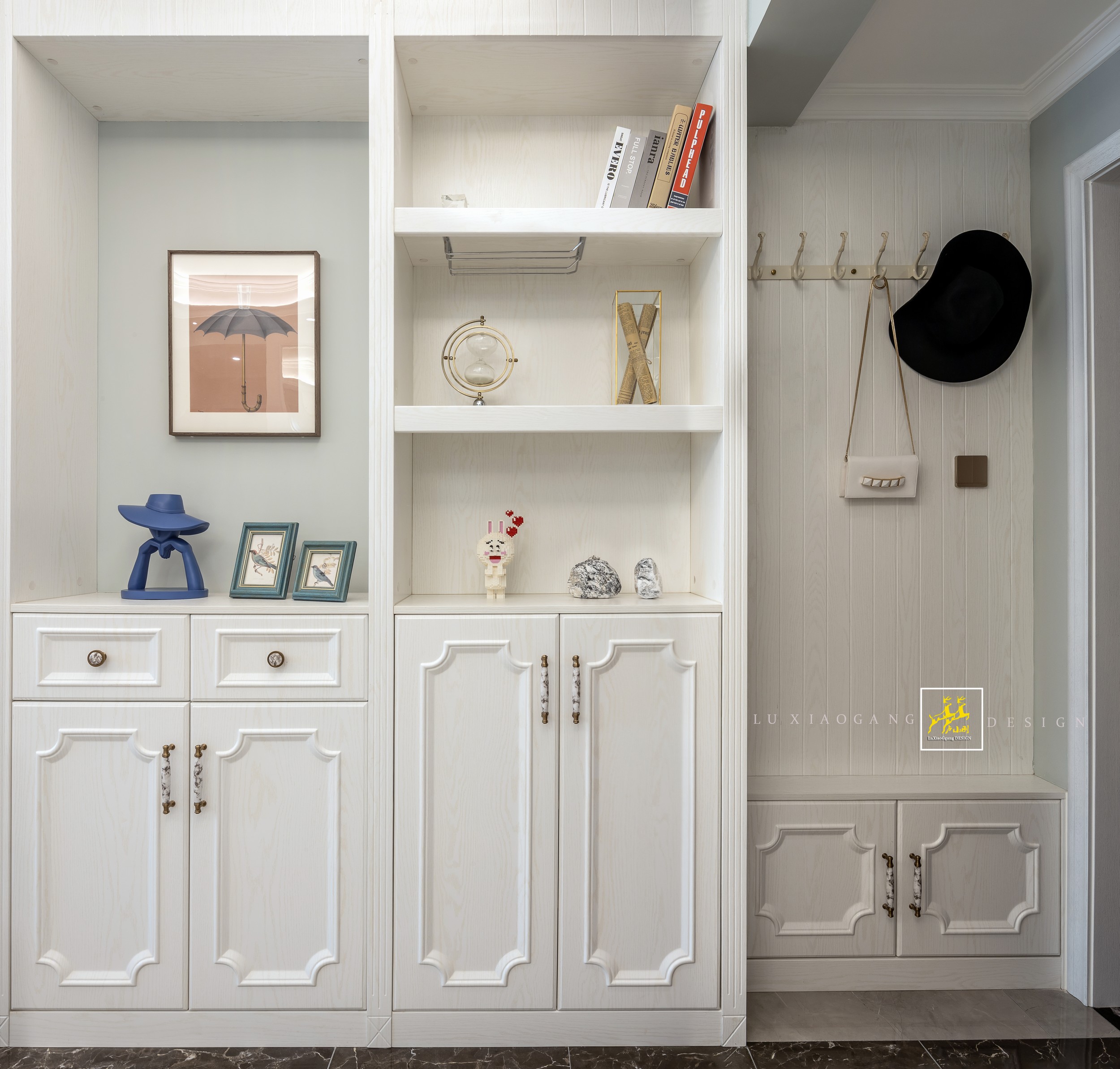 玄關(guān)處的柜子與護(hù)墻版集成一體,搭配白色的衣帽掛鉤更加方便適用。富有質(zhì)感的羅馬柱,加上鞋柜與酒柜的設(shè)計,集展示與收納功能于一體,完美的融合了藝術(shù)性與實(shí)用性。