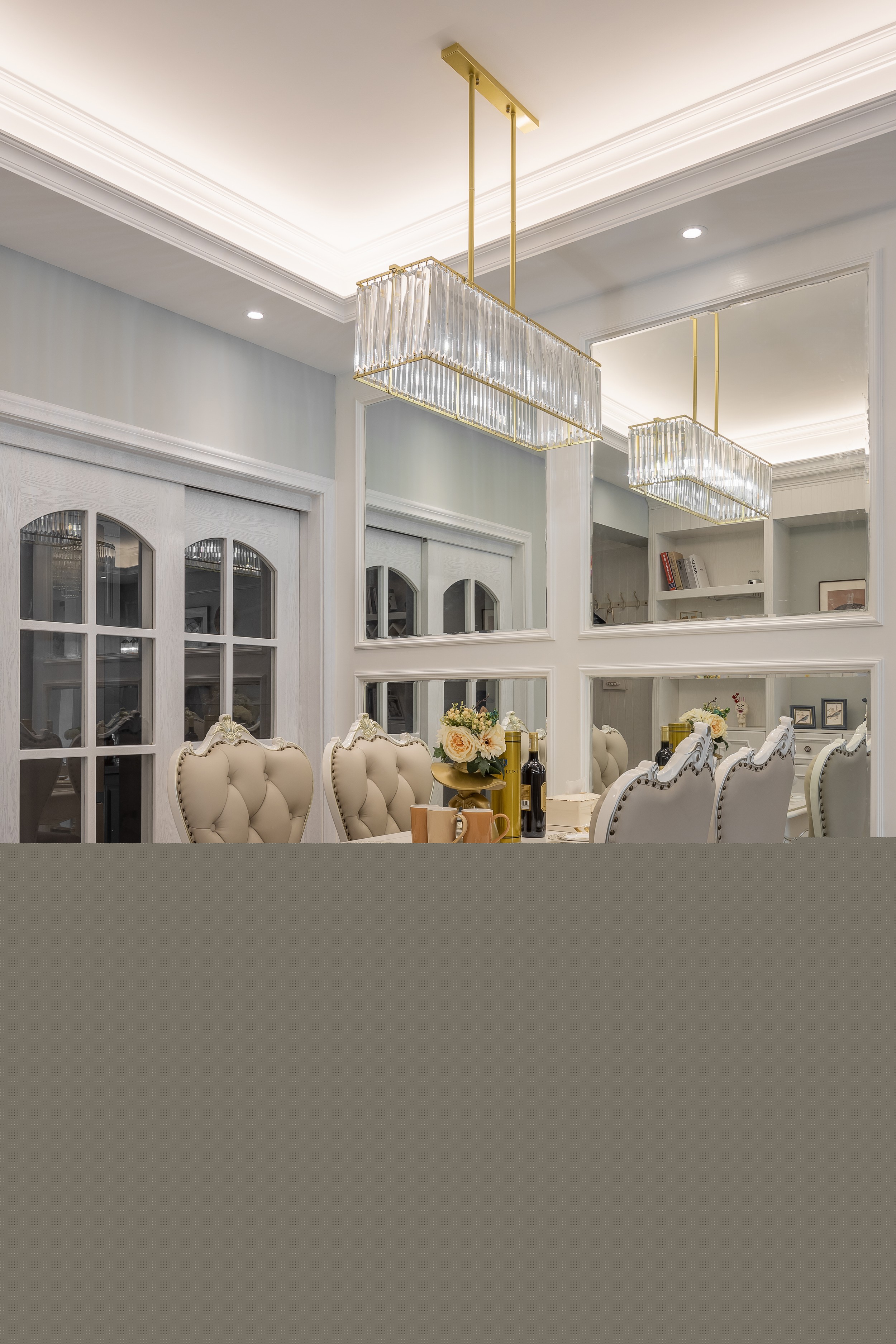 考慮到客餐廳的整體連接與空間過渡,餐廳設(shè)計以白色為主。設(shè)計師通過嵌在實(shí)木面板里面的鏡子,巧妙地增大了視覺空間。推拉門的改造則將廚房的活動空間變得更加靈活。