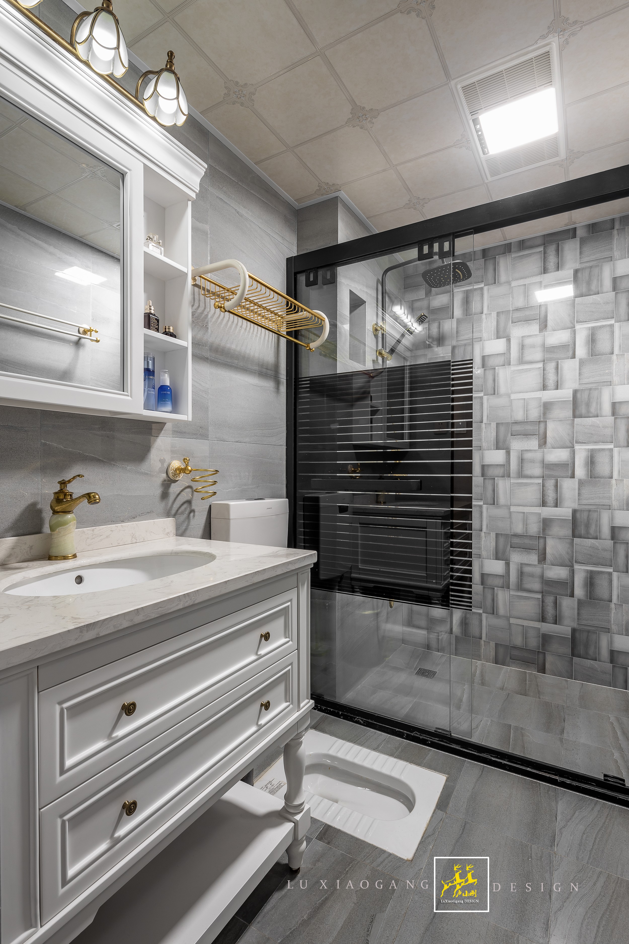 浴室的灰白混色背景墻增加了空間的流動性,古銅色水龍頭與灰、白、黑交織在一起,碰撞出簡而不凡的低奢優(yōu)雅。
