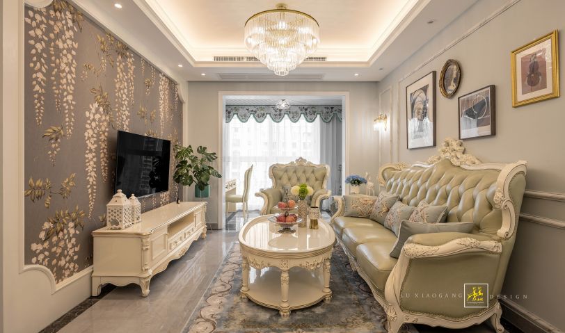 穿過玄關(guān)進(jìn)入客廳,客餐廳空間的無障礙銜接,增加了空間的延續(xù)性。客廳的整個空間采用了淺色系復(fù)古色調(diào),打造出了別樣的暖系歐式浪漫。