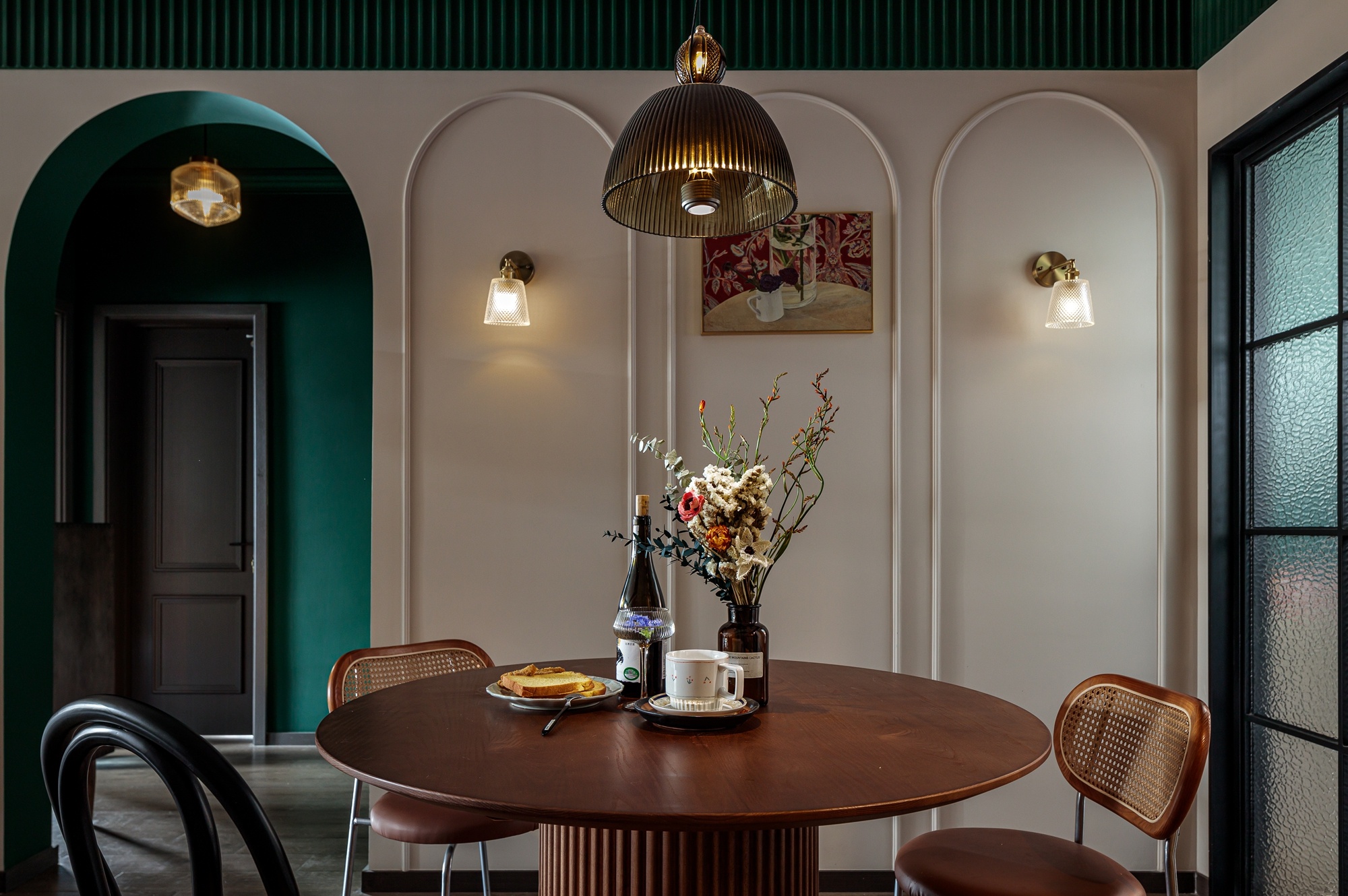 餐廳部分的光線會稍顯有點(diǎn)暗淡,廚房的玻璃門可以幫助餐廳引入部分光線,不用工作時(shí),一日三餐都在此處。使用圓桌,更有聚攏和圍合感,朋友聚會時(shí)會更有聊天氣氛。