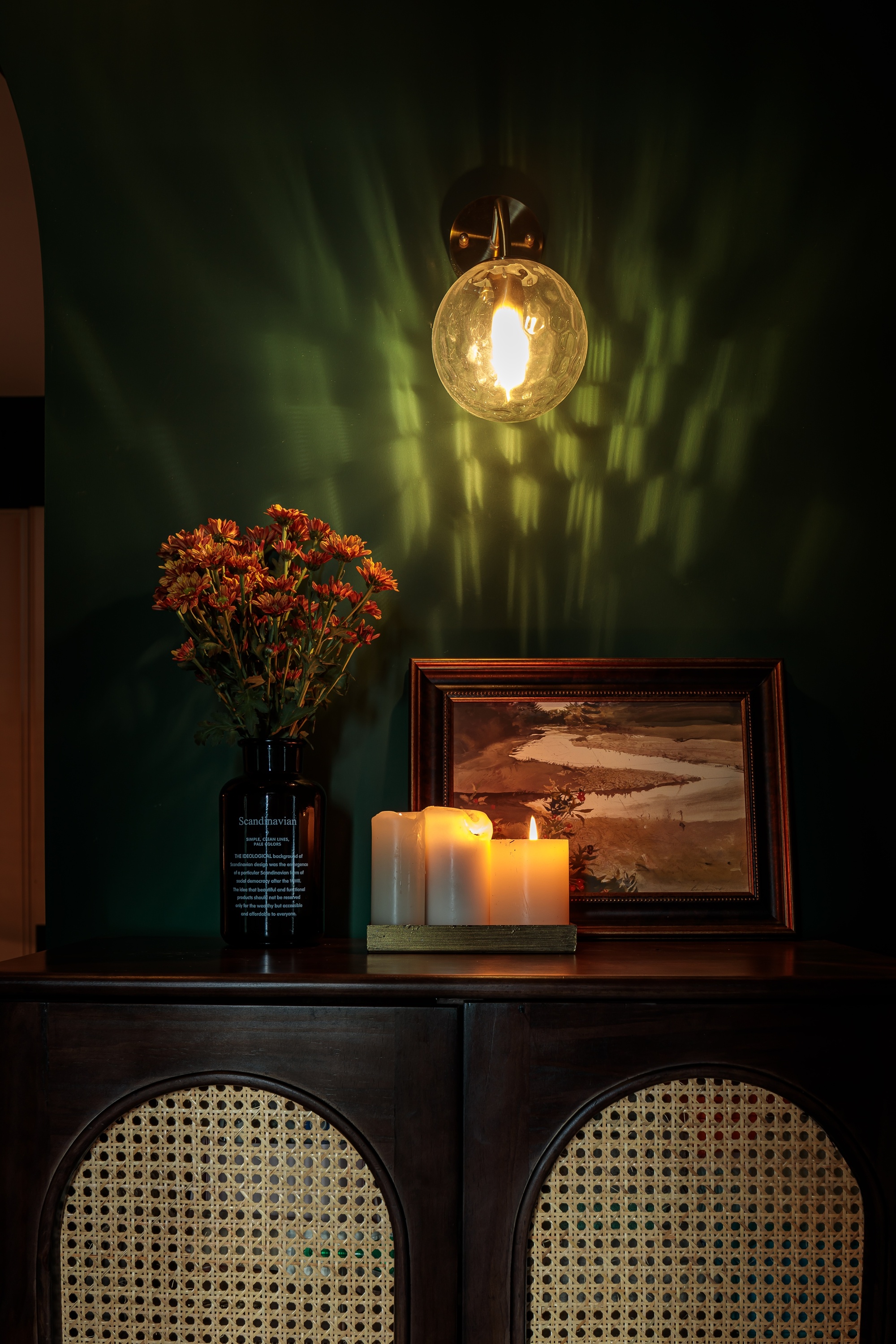 以色塊為墻體造型,壁燈、復(fù)古掛畫、都是屋主喜愛的配飾成品,將這些集合為空間的故事素材,進(jìn)一步豐富墻面的質(zhì)感。在紅綠之間融入淡金色沙發(fā),本身自帶的精致復(fù)古氣息,流連的金屬味道香醇而低調(diào),散發(fā)出舒適的溫暖氣氛。
