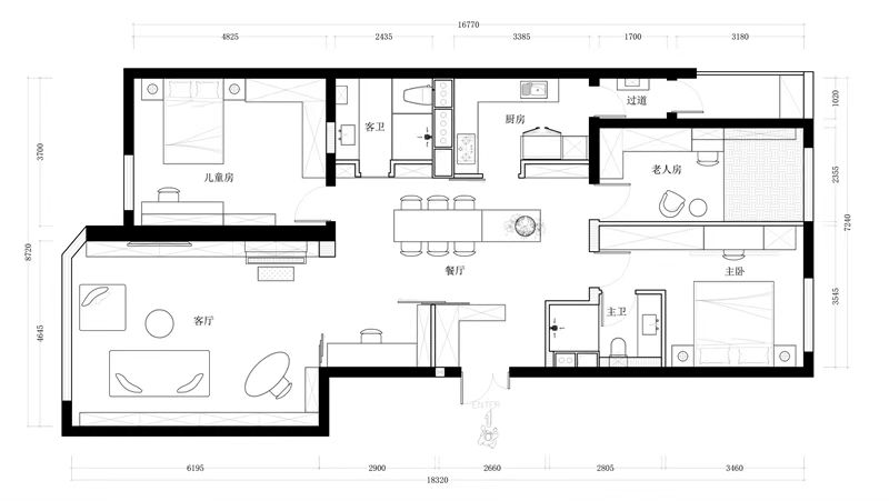 業(yè)主是一位阿姨,房子裝修主要給女兒的孩子上學用,要求是三個臥室,能有一個獨立的書房,包括客廳也需要放置書桌供其他人辦公使用,原始房子輕體墻已經全部拆除,所以去到現(xiàn)場之后整個空間都很開闊,采光也比較好,廚房、客衛(wèi)以及兒童房的位置為承重墻區(qū)域,不能做更改,所以考慮在客餐廳區(qū)域增加一個書房功能。