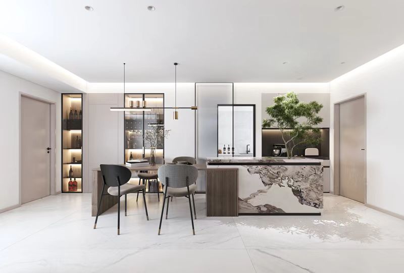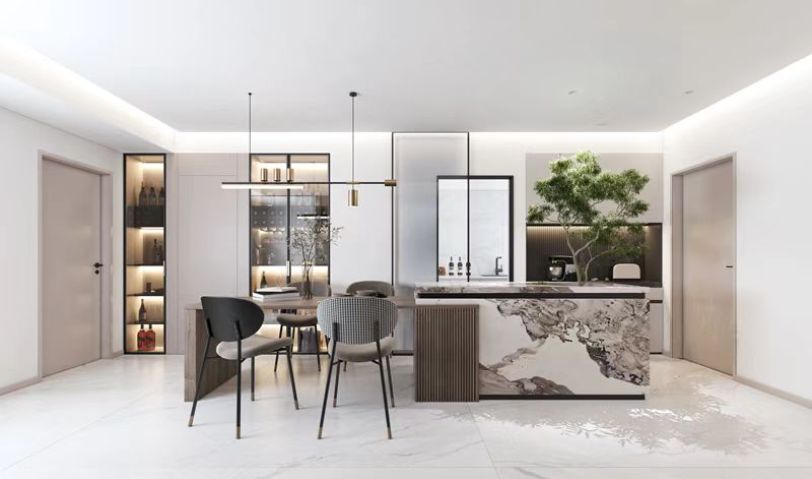 餐廳設置島臺+餐桌,島臺區(qū)域正對著入戶方向做一個造景,餐邊柜做玻璃柜門增加燈光效果讓整面墻有一個層次感。