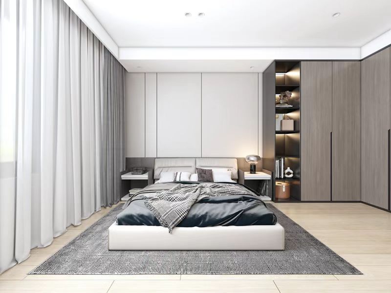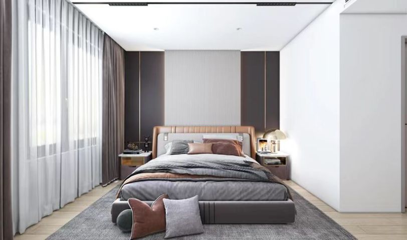 主臥呼應客廳,使用皮質床體配深色墻板。