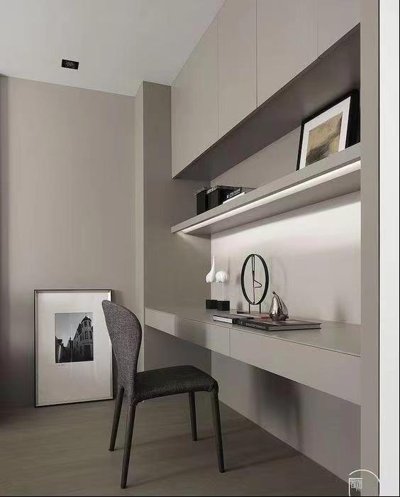 整個空間做無主燈處理,以白色為主,柜子造型簡單無拉手,搭配皮質沙發(fā)讓整個空間更有質感。