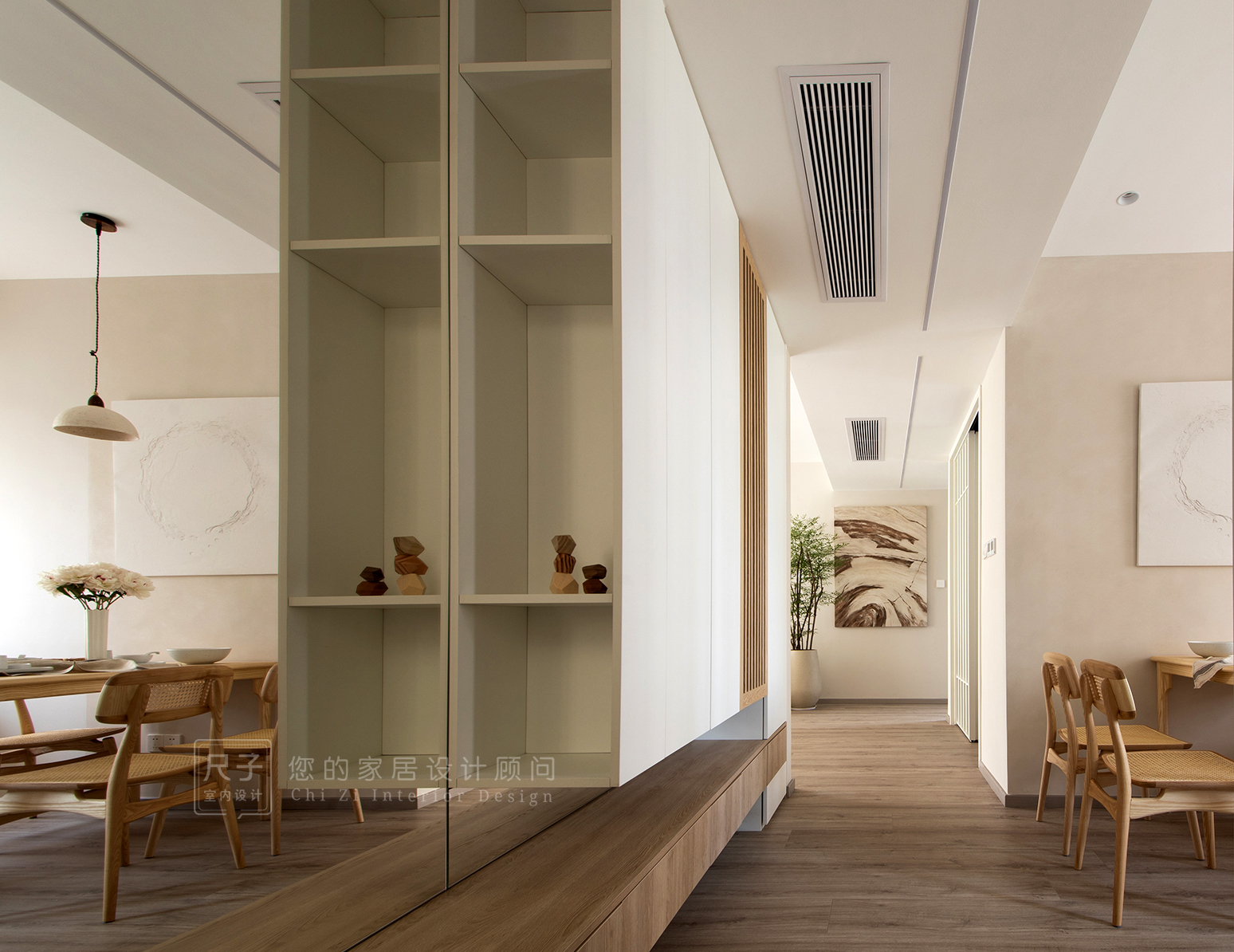作為從外面高速運轉的世界回到家的必經之地,玄關區(qū)域以木白兩色實現(xiàn)自然過渡,讓歸家的人卸下疲憊,進入這個“慢”世界。