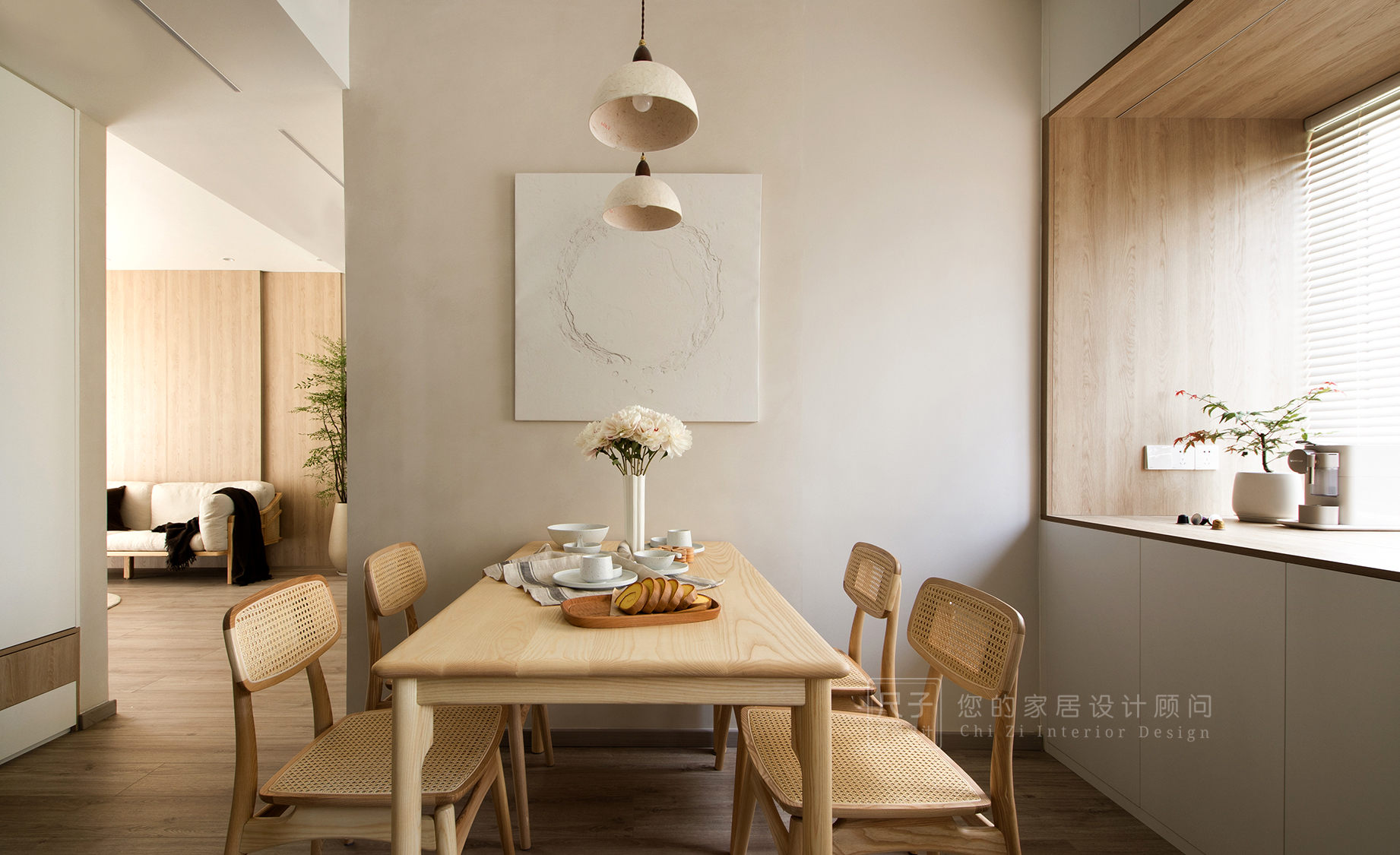 原木餐桌、藤編元素的餐椅給空間增添了一抹古樸的自然感,鮮花與枝葉點綴其中,為空間注入一股明媚的生機。